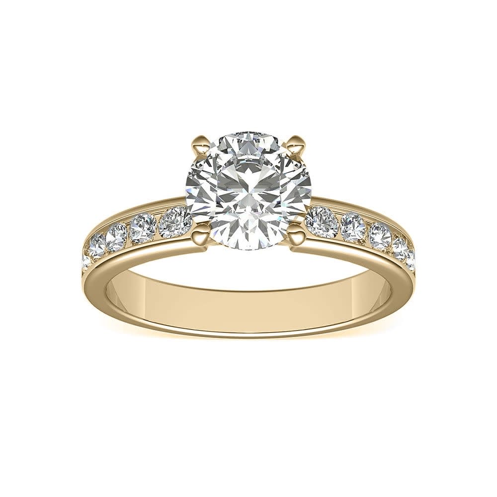 Cheerful and bright, this diamond engagement ring has a sophisticated edge and allures with its charm. It features a GIA certified claw set 0.60 carat diamond set on a scintillating channel-set diamond shank. Elegantly crafted in 18K gold, the sparkling diamonds radiate ethereal brilliance in a row. The band is available in 18K white, yellow, rose gold, and platinum 950. The jewellery is beautifully handmade to the highest standards. Shop directly from us and save over 40% when compared to high-street retail prices. We also offer unmatched 100 day returns. Buy online or book an appointment to visit our jewellery boutiques in Sydney and Melbourne.