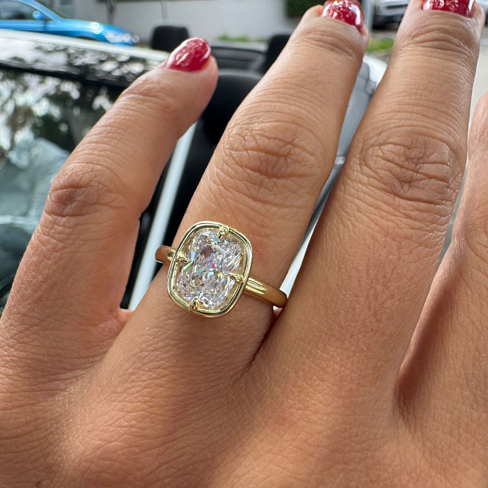 Elegant, refined, and effortlessly modern, the Elongated Cushion on a Bezel Setting ring is a stunning expression of timeless beauty. At its centre lies a graceful, elongated cushion-cut diamond, celebrated for its soft curves and elongated silhouette that beautifully enhances the brilliance of the stone. All Temple and Grace jewellery is beautifully crafted to the highest standards and is made at our jewellery workshop directly by us (skilled jewellery craftsmen). This is why you can save over 40% when compared to high-street retail prices. We also offer a lifetime warranty and unmatched 100-day returns. You can shop online or book an appointment to visit our jewellery boutiques in Sydney, Melbourne, Brisbane, Perth and Adelaide.