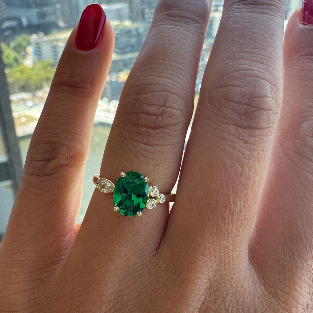 This exquisite ring is a stunning tribute to nature’s most enchanting hues. At its heart lies a lab-grown oval green emerald that glows with lush, verdant colour rich and vibrant, like dew-kissed leaves at dawn and the promise of new beginnings. The emerald’s deep green allure evokes both timeless sophistication and organic vitality, making it a jewel that feels alive with beauty. All Temple and Grace jewellery is beautifully crafted to the highest standards and is made at our jewellery workshop directly by us (skilled jewellery craftsmen). This is why you can save over 40% when compared to high-street retail prices. We also offer a lifetime warranty and unmatched 100 day returns. You can shop online or book an appointment to visit our jewellery boutiques in Sydney, Melbourne, Brisbane, Perth and Adelaide.