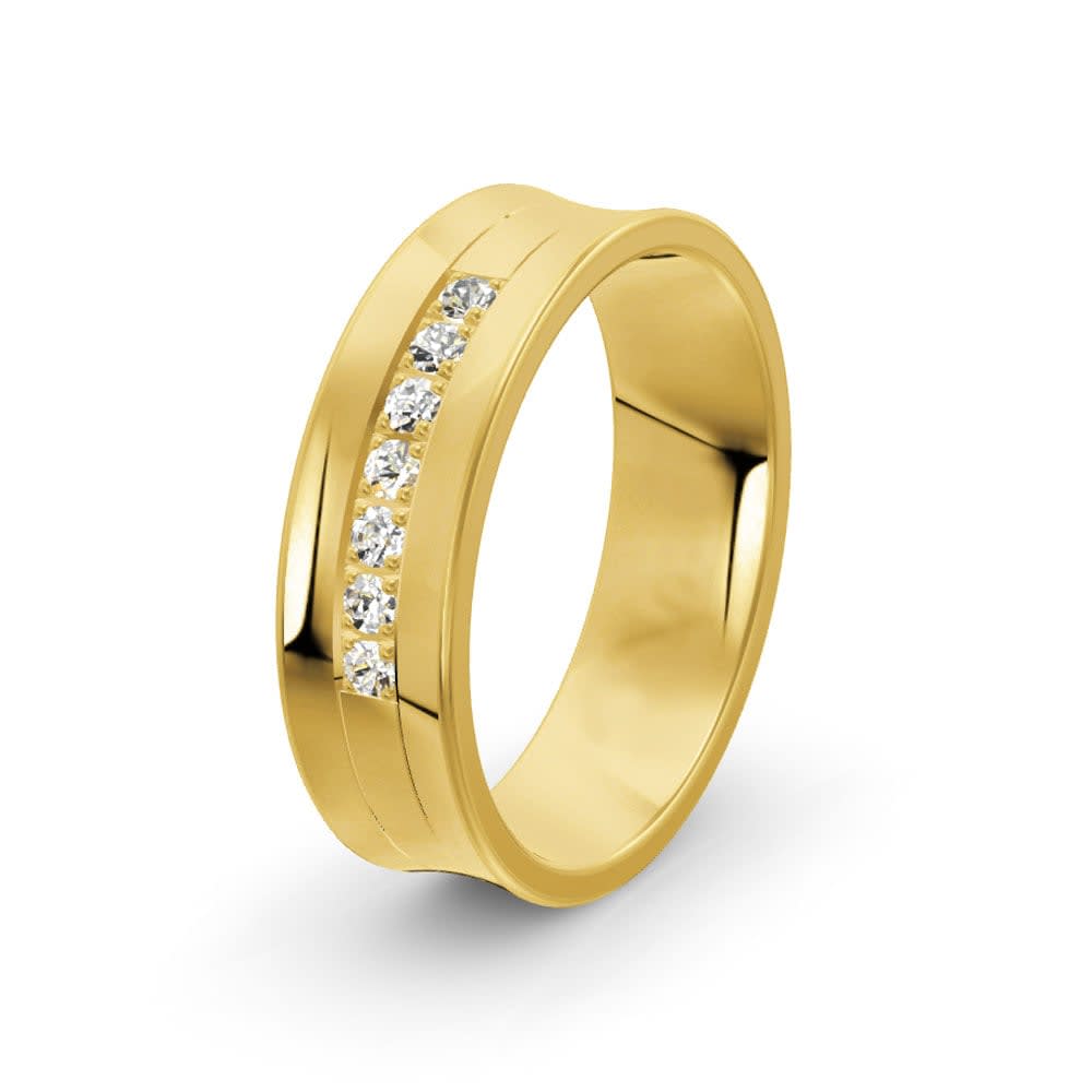 A contemporary band showcasing a row of brilliant round cut diamonds in a refined channel setting. The smooth curves and polished finish add to its sophisticated appeal. All Temple and Grace jewellery is beautifully crafted to the highest standards and is made at our jewellery workshop directly by us (jewellery craftsmen). This is why you can save over 40% when compared to high-street retail prices. We also offer a lifetime warranty and unmatched 100 day returns. You can shop online or visit our jewellery stores in Sydney, Melbourne, Brisbane, Perth and Adelaide or book an appointment to visit our jewellery boutiques.